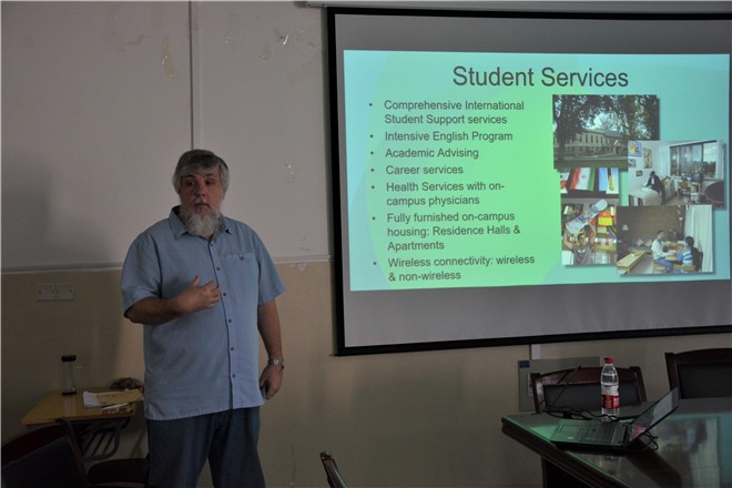 会上,Boone教授首先介绍科罗拉多州立大学所在城市科林斯堡——一个被誉为美国最适宜居住的城市,并从人口、气候、交通等方面强调了科罗拉多州立大学所处位置的优越性。随后,Boone教授依次从学生服务、流域科学学位、学院知名学者、WCNR亮点等方面为在座师生介绍了科罗拉多州立大学特色学院之一——自然资源与环境学院,并就学院的学科特色优势进行重点介绍。此外,Boone教授引用老子的“千里之行,始于足下”这句话,告诫大家学术研究不应单单纸上谈兵,而应立足于实践。