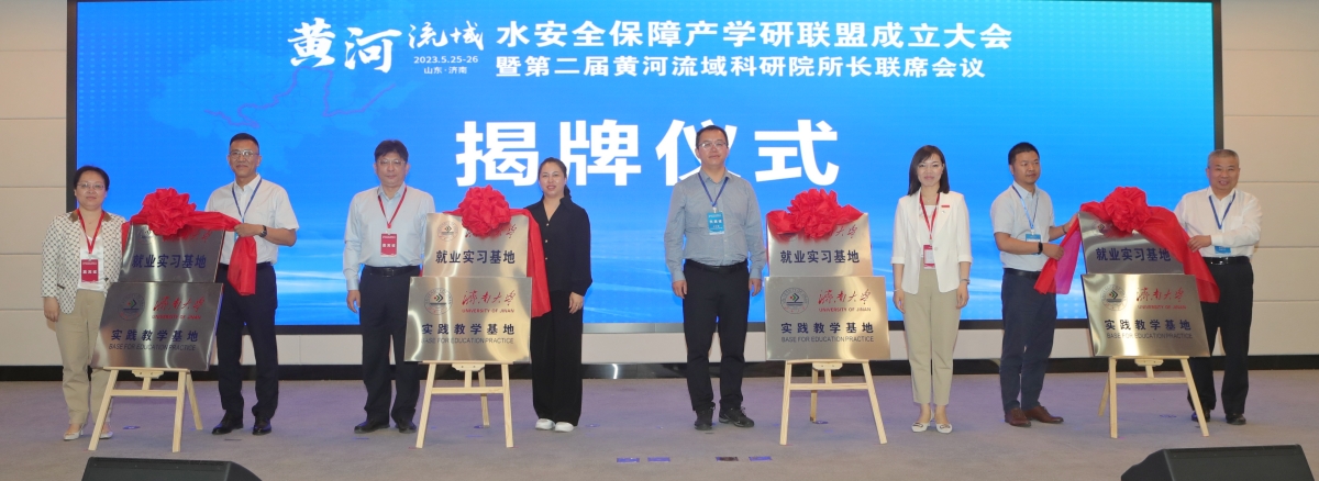 济南大学党委副书记杨景波,党委学生工作部部长刘芝,教务处副处长张婷,德赢VWIN学院院长徐征和与山东新汇建设集团有限公司、甘肃省水利科学研究院、山东黄河勘测设计研究院有限公司、浙江河海中控信息科技有限公司四家单位代表共同为济南大学就业实习基地和实践教学基地揭牌。