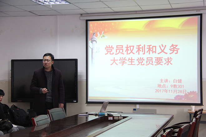 11月28日中午,资源与环境学院入党积极分子培训班第六讲在九教301顺利开讲。资源与环境学院2016级辅导员、地理科学与规划系学生党支部书记白健老师为入党积极分子作“党员权利与义务”主题报告。