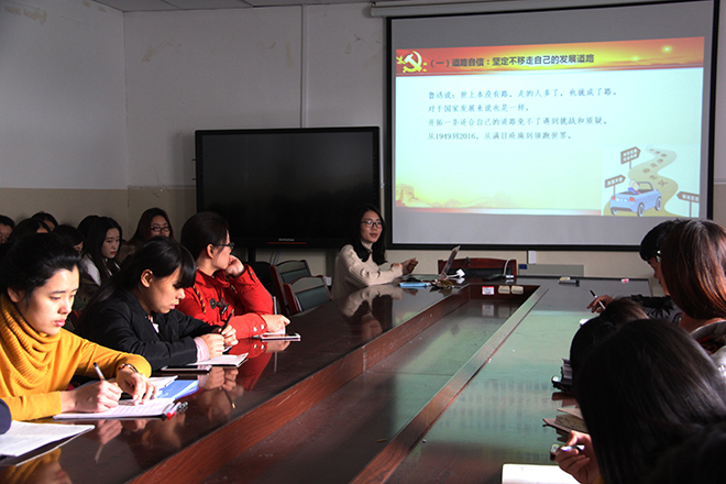 11月30日中午,资源与环境学院入党积极分子培训班第八讲在第九教学楼301会议室顺利开讲,由2014级辅导员高蓉蓉老师给同学们作“坚定‘四个自信’共筑中国梦”主题的报告。