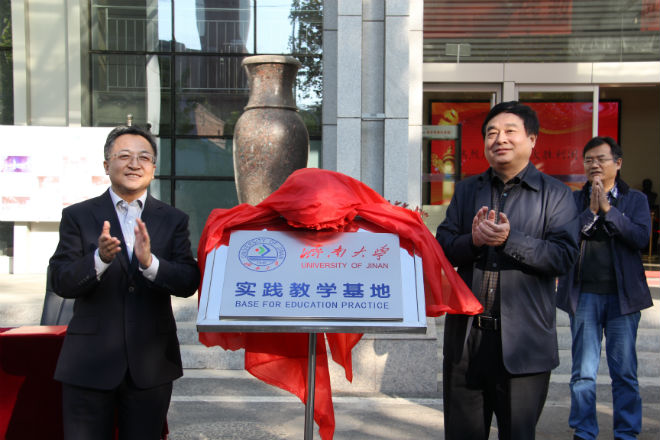 最后,山东省地质博物馆馆长张鲁府与资源与环境学院党委书记马振民代表双方签订共建协议,测绘地理信息局局长赵培金与济南大学副校长王志一同为实践教学基地揭牌。