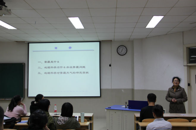 周保华老师通过数据列举与图表展示,从雾霾是什么、地理科学为什么关注雾霾问题、地理科学对雾霾天气的研究贡献三个方面揭示了雾霾与地理科学之间的紧密联系。最后,周老师鼓励同学们积极参与到即将开展的新生研讨课中去,呼吁大家认真学习专业知识,合理利用网络、图书馆等资源丰富自我、关心环境,时刻谨记“同呼吸共责任”的环保理念,增强节能环保意识,养成良好的环保习惯。