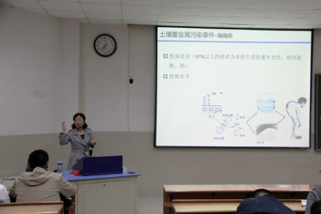 她通过图文结合、举例子等方式,向在座学生展现了国内目前土壤重金属污染不容乐观的现状,并呼吁同学们能从自身做起,加入到防止重金属污染的行动中。接着,李老师对重金属污染耕地修复技术进行重点介绍,一要对中低度污染农田需加强水肥管理和品种,二充分利用Cd低积累水稻品种,三调节土壤pH,四发展农田土壤的联合修复技术。讲座结束后,李合莲老师就重金属土壤修复方法和土壤污染的其他种类与同学们展开交流和探讨,同学们纷纷表示获益匪浅。