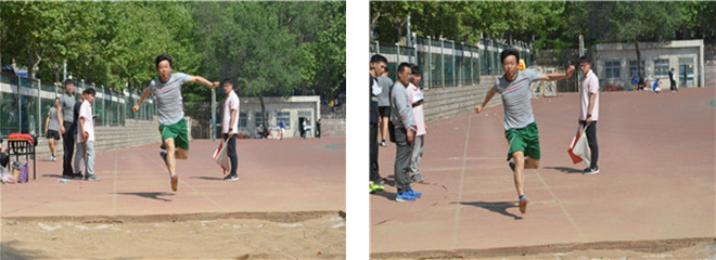 比赛开始前,运动员们满怀自信,各自做好准备活动,积极调整心态,将自己的状态调到最佳,准备在此次三级跳比赛中发挥出最好的水平,争取突破自我。紧接着的哨声打破了原本平静的气氛,运动员们各自进入备战状态,选手们有序的轮番上场。离弦似的助跑、有力的起跳、平稳的落地,庞老师所有的动作一气呵成,轻捷的身影在空中划出一条条优美的弧线。在起跳的一瞬,他已经突破了自我,资源与环境学院的观众也被学院老师的竞技精神所熏陶,纷纷摇旗呐喊为老师助威。最终,庞桂斌老师取得了第三名的优异成绩,为学院增添荣誉。