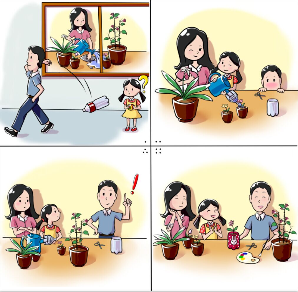 鲁丹同学的科普创意漫画作品《爸爸的饮料瓶》,描述了一个正在玩耍的小孩,在看到爸爸随意丢弃的饮料瓶后,和妈妈一起将饮料瓶改造成节水的水壶喷头,爸爸看到后积极改进自己,把用剩的饮料瓶做成一个精美的小花瓶。作品通过生活中一家人对“父亲丢弃的塑料瓶”进行思考改造,二次利用的环保小事,呼应本次科普创意大赛“我身边的环保行为”创作主题。作品旨在呼吁人们在生活中善于思考创新,对生活废物进行合理的二次利用,即可变废为宝,减少生活垃圾制造,达到环保生活的目的。