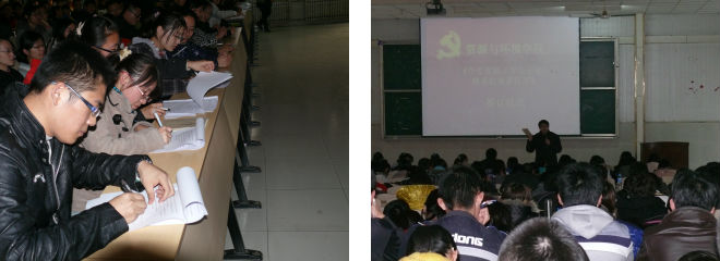 会议伊始,由自律会主席纪亮向大家宣读了《资源与环境学院宿舍综合测评实施办法》、《学生宿舍安全公约》,并由学生会主席王毅宣读了《学生党员(学生干部)联系寝室责任书》,我院新实施的宿舍管理办法要求采用党员联系制度,即学生党员(学生干部)以“就近原则”负责联系本寝室及邻近的若干个寝室,做好安全员、协调员、汇报员。随后,学生党员代表李迎运同学发言,他表示成功的宿舍管理办法是同学们愉快生活和学习的保障,是学院顺利开展学生工作的基础,需要我院全体学生的积极配合。学生党员要率先垂范,以自己的实际行动积极倡导健康文明的大学生活。之后,在资源与环境学院学生党员和学生干部的组织下,到场的全体同学有序的签订了《学生党员(学生干部)联系寝室责任书》及《宿舍安全公约》,并纷纷表示严格遵守新规定,做好表率。最后,陈书记就本次启动仪式做了总结,并对这项工作的顺利开展寄予良好祝愿。
