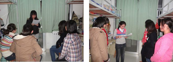 学院领导要求学生党员在学院“率先垂范树正气 严守纪律开新风”主题团日活动中起好表率作用,带头做好宿舍文化建设,营造良好舍风学风。在资源与环境学院学生党支部集思广益下,积极围绕活动中心,立足实际、紧密结合学生党员特点,在各年级学生宿舍中加强宣传我院宿舍管理新办法,由学生党员向同学们详细讲解《资源与环境学院宿舍综合测评实施办法》、《学生宿舍安全公约》,充分落实《学生党员联系寝室责任书》,采用党员联系制度,即学生党员以“就近原则”负责联系本寝室及邻近的若干个寝室,扮演好安全员、协调员、汇报员的角色。通过规范的制度约束学生的行为,增强组织纪律观念,养成良好的生活习惯,从而形成积极向上的宿舍文化氛围。