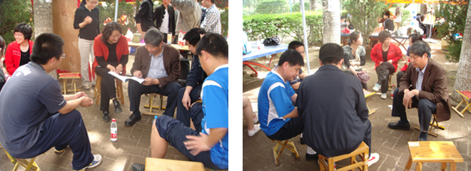 参赛的在操场上健步如飞,创造神话,未参赛的老师们围坐一起,或与学生打招呼,或一起交谈,往日的严肃认真,今日先放一边,现在,我们是青春活泼的运动员。有人拍肩问一句,对今天比赛可有信心,爽朗一笑,重在参与的意思跃然面上,自信从容的笑容,彰显了倜傥的风度。