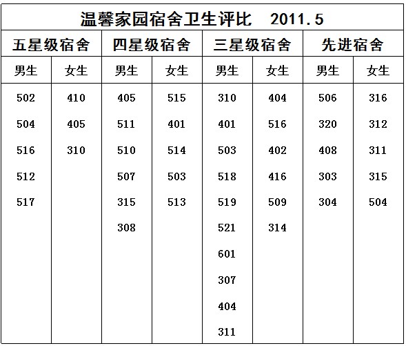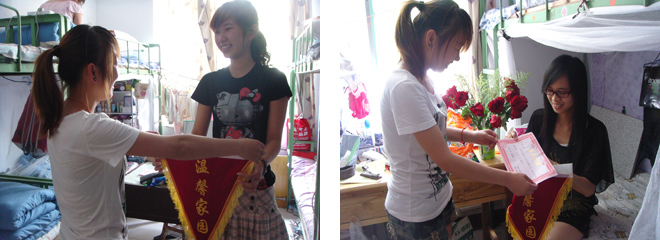 此次学生宿舍文化评比活动,评选出五星级宿舍8个,四星级宿舍11个,三星级宿舍16个和先进宿舍10个。星级宿舍评比活动得到了老师和我院同学的广泛支持,同学们积极参与宿舍卫生打扫、宿舍文化建设,取得了很好的效果。为鼓励同学们在“温馨家园”活动中的积极表现,自律会干部刘香花等人带着奖状、表彰旗帜和各种活动奖品走进获奖宿舍,为优秀宿舍颁发奖励。颁奖过程中,获奖宿舍的同学们纷纷表示,一定会继续坚持下去,努力保持好良好的宿舍文化氛围。
