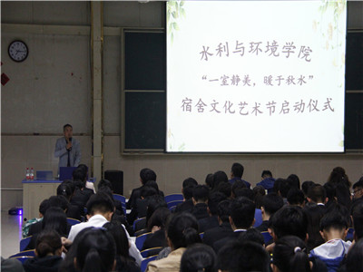 仪式上,尹鑫老师首先对宿舍文化艺术节的概况及往届艺术节开展形式及举办成效做简单介绍。随后,第一届学生联合会宿管中心分管主席袁野介绍本届宿舍文化艺术节的背景及意义,并对具体活动内容及时间安排做详细介绍。本次活动分为两大部分,分别是“浮光·掠影故事汇”和“一室静美,暖于秋水”活动。“浮光·掠影故事汇”要求学生采用以“浮光”为主题的文字形式结合以“掠影”为主题的摄影形式与他人分享美好的宿舍生活。“一室静美,暖于秋水”系列活动包括四个阶段,分别为:“窗明几净,室结若映”宿舍卫生评选大赛,通过卫生检查进行评分;“秋华落处,月华满屋”文化建设大赛,各宿舍自行设计舍徽,并对宿舍进行装饰;“安若泰山,防患未然”宿舍知识安全大赛,各宿舍以舍长为代表进行参赛;“仙山琼阁,芳年华月”宿舍风采展示大赛,参赛者将以宿舍为单位进行个人才艺展示或ppt展示,对宿舍进行介绍。所有活动阶段完成后,将举办“一室静美,暖于秋水”宿舍文化艺术节颁奖仪式,表彰优秀宿舍,并为同学们树立榜样。