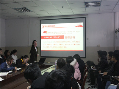 会议开始,尹鑫老师对学习和发挥模范作用的结合点进行阐述,强调学员要端正入党态度,树立正确入党动机。她指出:作为一名入党积极分子,我们的信念是全心全意为学生服务,做一名真正让学生认可的优秀学生。在各级党组织的活动中,学院坚持引导全部学生,特别是班委成员、舍长、学生组织成员等自觉学习党章,遵守党章,贯彻党章,维护党章。作为入党积极分子,更应自觉加强各方面的修养,切实做到为学生分忧,为老师分忧,时刻以党员的要求严格要求自己。随后,老师引出两件案例对如何做到合格党员的标准,如何以党章指引坚定信念,如何以党规为指引坚定信念,如何真正做到坚定信念跟党走进行了详细的讲解。尹鑫老师建议大家要拓展自己的知识面,从学习中完善自己,提高党性认识,争取早日成为一名合格的共产党员,以便更好的服务他人。最后老师告诫学员们坚决反对官本位思想,一定要全心全意服务同学,做到干一行爱一行,爱一行钻一行,提高做好本职工作,用工作成果来提现自己的纯洁性。