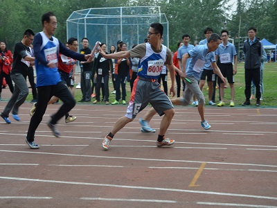 代表水环学院参赛的四位老师,随着发令枪的响起,身体一下紧张起来,只见第一棒的黄波老师拿稳手中的接力棒如离弦之箭向前猛冲。在接近下一棒队友时,他们将手中的木棒呈约45度角向下压去,而接棒的刘英豪老师回头并将手臂向后伸去,手腕内旋,掌心向上,同时开始小跑前进,尽展接力技巧。站在赛道两边的同学们同样激情澎湃,嘴里不停地大声喊着“加油,加油!”。一次一次的接力棒的交接,更将现场的气氛推向高潮。转眼,最后一位宋鹏老师已手持接力棒冲向终点。最终,在学院四位老师的坚持和默契配合下,取得第三名的佳绩。