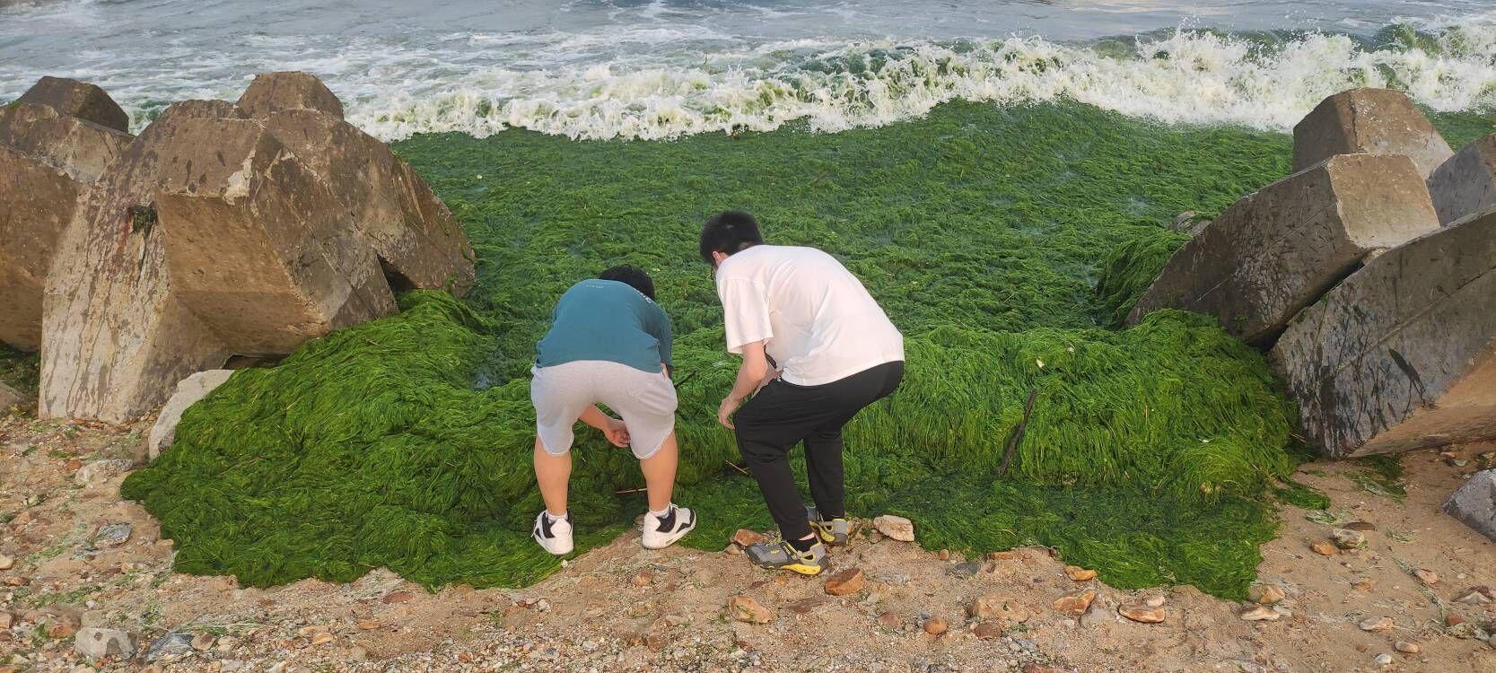 为更加深入了解浒苔爆发的原因,团队成员现场的工作人员进行了采访。据采访团队成员了解到,浒苔暴发是复合作用的结果,近海人类活动、陆源营养输入、地域特征、浒苔自身特点、生物之间相互作用、全球变暖与气候事件等多种因素,以及这些因素的动态变化和相互作用,共同决定了浒苔绿潮爆发的特点和规模。接着,为对浒苔进行进一步研究,团队成员对浒苔进行了采样。由于浒苔在离水或晒干后会变得很少且发出恶臭,所以团队成员提前联系好顺丰的工作人员一同前往海岸下海采集浒苔样品。为保证浒苔的新鲜程度以及原有的生长环境,团队成员前往近水区开展取样工作。邮寄样品完成后,团队成员又前往山海天公园进行环保教育知识普及。通过向周边居民以及旅游者分发中国公民生态环境与健康素养科普宣传单的形式,与他们共同探讨当今我们面临的严峻环境问题的方式,普及环保知识,增强环保意识,规范人们的行为,促进形成良好的社会风尚。