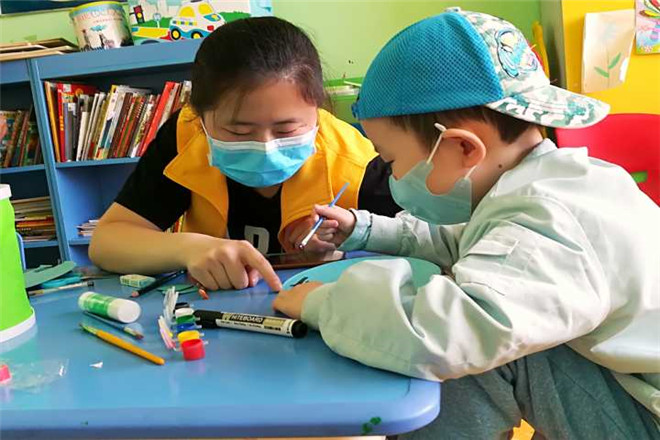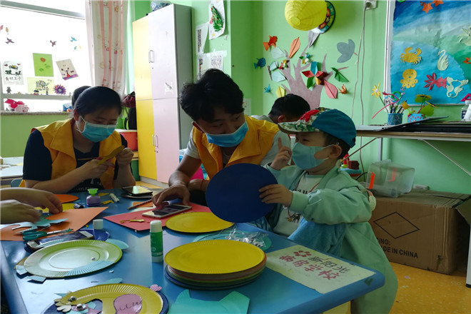 志愿者们积极为小朋友准备好纸盘、剪刀、染料等物品,上网搜集教学材料,保证教学过程有序进行。随后,在志愿者们的详细讲解下,孩子们开始学习制作动物纸盘。志愿者们一边循序渐进地引导孩子们,一边又鼓励孩子们开动脑筋,在制作的纸盘上添加自己的创意。在孩子们与志愿者们的共同努力下,纸盘上出现了各种彩色动物,孩子们兴奋地把作品送给父母表达感谢,父母脸上也因此洋溢着幸福笑容。