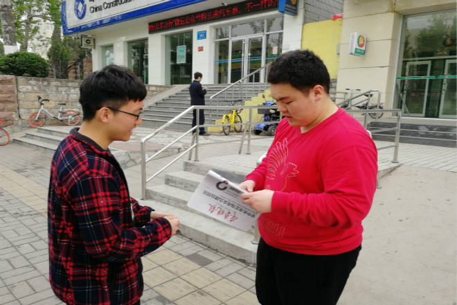 4月14日,德赢VWIN学院青年志愿者协会联合齐鲁晚报张刚大篷车开展报纸义卖活动,为我校一名在校大学生患肝硬化的父亲募捐善款,学院共有90余人参加活动。