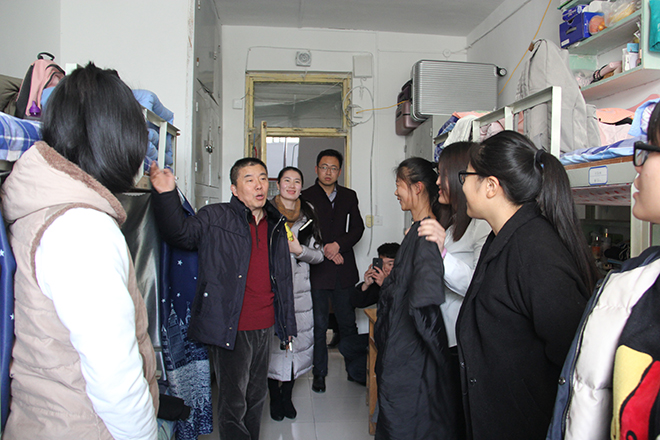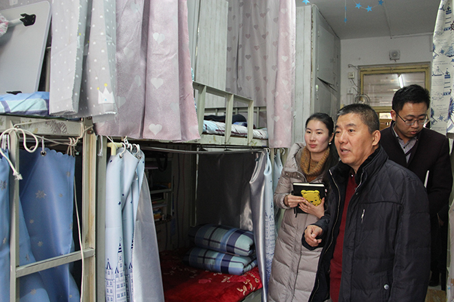 12月5日下午,老师们重点走访了学生公寓1号和17号楼的新生宿舍,并对16级的部分学生宿舍进行抽查。在检查过程中,侯书记与在场学生进行亲切交谈,详细询问学生们的日常生活情况,仔细聆听学生们在生活中遇到的问题和收获。针对同学们提出的宿舍空间拥挤的问题,老师纷纷跟同学们分享了自己上学时收纳整理的技巧,还向同学们普及宿舍安全用水用电的知识,指导同学们合理布置宿舍电线,排除宿舍安全隐患,保持宿舍卫生整洁。在此次检查中,宿舍整体状况良好,内务整洁,无安全隐患。侯书记对同学们提出表扬,并指出缔造安全温馨的宿舍环境,凝聚团结和谐的宿舍精神对学生们的学习生活有重要的影响和意义。