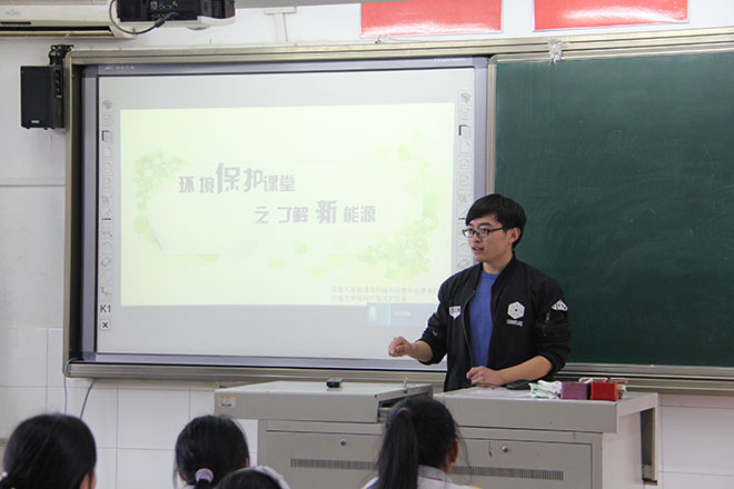 11月7日,济南大学资源与环境学院青年志愿者协会的志愿者们走进南辛庄小学开展“新能源”的宣讲活动。