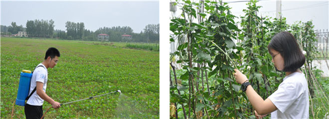 接着,志愿者们帮助农民阿姨在田地里喷洒农药。在喷洒农药之前同学们认真学习了对施药地区实际选择农药的正确用量、兑水量、使用方法,并做好自我保护。在专业技术人员的指导下,志愿者们很快熟练操作。同学们在学习知识的同时也收获到劳动的幸福感与成就感,切实做到知识与实践相结合。