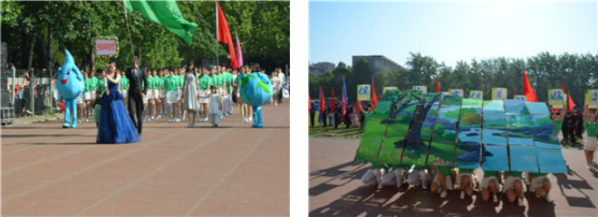 伴随着入场音乐的响起,各学院代表方队以各自独具创意的方式依次入场。资源与环境学院方队身着绿色院服,精神饱满,迈着整齐划一的步伐向主席台走来,“青春不凡 起航扬帆 虎踞龙盘 唯我资环”,响亮的口号展现了学院师生的斗志与自信。方队在主席台前停驻后开始变换,即刻便形成前方呈斜面状的图画、后方标语的组合样式。随着同学们喊出“心系环境 倡绿色生态 保护环境 享美好未来 ”的标语,方阵前方由黑白色的环境污染图画变作青山绿水的美景。方队洪亮的声音、别出心裁的入场方式令评委眼前一亮,同时也博得了在场观众的掌声阵阵。所有学员方队入场完毕后,运动员和裁判员代表在主席台上庄严宣誓。开幕式最后,不日前落幕的“活力健身操”的全部参赛队伍齐聚北苑操场,进行健身操表演,富有青春活力的表演为此次开幕式画上了圆满的句号.