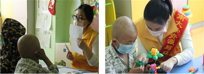 下午三点半,志愿者们准时来到病房学校,与现场工作人员一起将病房进行仔细消毒,并陪伴陆续到来的患儿们玩耍玩具,孩子们纷纷露出愉悦的笑容。在随后开始的授课中,志愿者们帮助工作人员准备教学用具,通过对交通工具,飞鸟游禽和瓜果蔬菜等常见事物的介绍,让孩子们在踊跃回答问题的过程中加深对于“分类”这一重要方法的认识。在休息时间中,志愿者们为患儿们准备好颜料和画笔,在帮助孩子们绘画的同时还教导了关于调色的知识。在志愿者们和孩子们愉快地进行了拼图游戏后,本次志愿活动也走向了尾声,孩子们童真盈溢的欢声笑语和依依不舍的挥手告别为本次活动画上了圆满的句号。