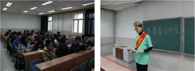 讲座伊始,主讲人向志愿者们介绍了志愿工作的定义和青年志愿者标志的美好寓意,解释了志愿者工作具有的志愿性、无偿性、公益性、组织性四大特征和志愿者奉献友爱互助进步的精神内涵。随后主讲人借助幻灯片向志愿者们讲述了志愿者组织的起源、发展与现状和中国志愿者的历史与发展,详细地介绍了志愿活动对于个人、社会及服务对象的积极意义。主持人向志愿者们介绍了资源与环境学院长期进行的新阳光病房、敬老院等志愿活动。讲座最后,主持人带领志愿者一同宣读志愿者誓词,立志将志愿活动坚持下去,服务他人,奉献社会。