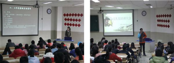 在首先进行的公文写作培训中,主讲人详细介绍了公文写作的基本概念及格式标准、工作总结的具体格式、活动策划的写作方法与要求等方面的内容。随后,主讲人通过幻灯片向同学们展示正确的仪态举止,并与台下的同学积极互动,演示正确的站姿、坐姿。同学们在积极参与中亲身感受到正确的仪态举止对一个人的影响。随后,几位主讲人依次上台对摄影、新闻写作、office软件的使用进行详细讲解。同学们在培训过程中认真记录,纷纷表示获益良多。