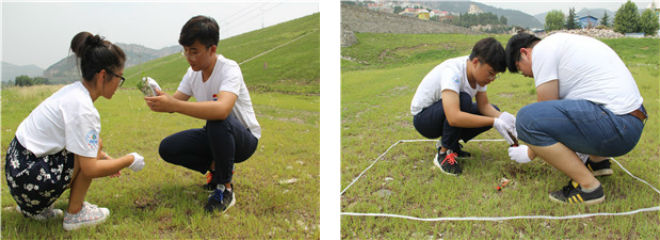 两个小时的车程中,调研团队员们谨慎的将土壤采集仪器带到现场并对装置进行最后的检查。在村委会工作人员的带领下,调研团来到土壤采样地点。经过前期对周围环境的勘察,取样小组通过对周围污染源的分布、污染方式以及污染历史和现状的了解很快确定了取样方法。在对剖面进行修整、清理后,取样队员将最表层的浮土除去,然后按照层次自上而下逐层从中心典型部位取样收集到铝罐中去,并分类将采集到的土壤分装到密封袋中进行标记。队员们利用携带的仪器对所取土壤进行基础性、专业性的数据分析并详细记录。随后,队员们收集了当地几种常见的植物,为后期生态瓶的制作收集样本。