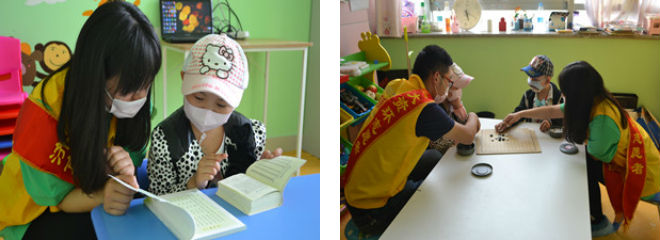 下午志愿者一行早早来到病房,为病房学校组装电脑桌和进行常规消毒处理工作。准备完毕后,病房学校迎来了上课的孩子们。老师将孩子们分为两组,年龄稍大一点的孩子由志愿者帮助他们学习查字典,小一点的孩子们在志愿者的陪同下读故事书。孩子们天真童趣的问题总是让在场的志愿者们会心一笑。短暂的休息过后病房学校的老师教志愿者们和小朋友一起做了手工蝴蝶结,尽管小朋友们的作品不尽完美,但过程中他们收获了快乐。在志愿活动快要接近尾声的时候,小朋友和志愿者两两一组展开了五子棋的博弈,在志愿者的指导下两个小朋友你来我往互不相让,孩子们脸上洋溢的笑容是志愿者最大的安慰。