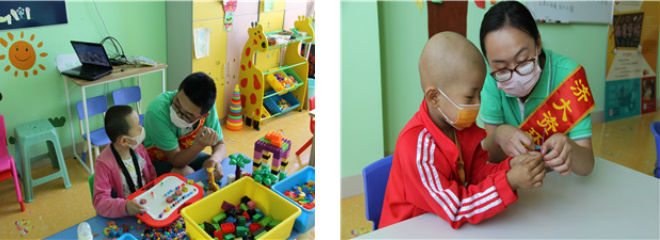 下午三点,志愿者们准时来到病房学校,在与现场工作人员交流了解注意事项,做好充分准备后,迎来了到此上课的儿童。志愿者带领孩子们背诵古诗,为孩子们讲述古诗背后蕴含的故事,志愿者用妙趣横生的讲解增加古诗背诵的趣味性,加深孩子们对古诗的理解。在遇到不认识的字时,志愿者悉心教导孩子们如何利用字典查询自己不认识的字。学习之余,志愿者与孩子们一同玩拼图,搭积木,做手工。病房中充盈着欢快的气氛,看到孩子们脸上洋溢的笑容,志愿者们倍感欣慰。