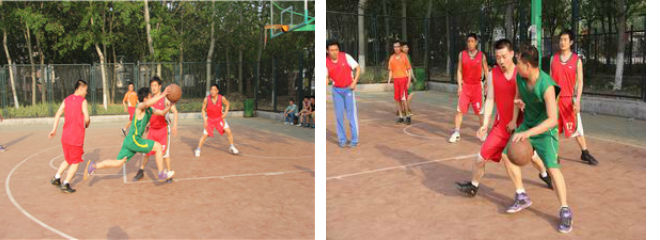 首节比赛,前段时间由于双方手感不佳都无得分进账,经过了一段防守大战后,资环学院教职工代表队率先找到状态,并以一记弧顶中距离跳投打破僵局,随即数院以一记长传快攻上篮紧咬比分,但此后,进攻端突然哑火。资环学院代表队抓住机会,依靠稳定高效的半场阵地进攻接连得分,最终以20:8比分优势结束上半场。半场休息后易地再战,数院代表队掀起反攻,将分差一度缩小至个位数,此时学院代表队沉着冷静,及时变换防守策略,遏制住了对手的反扑势头。凭借顽强的防守和篮板保护,以及流畅无解的进攻,学院代表队密切配合,一个个精彩的进球将现场比赛氛围推向高潮。最终,实力更胜一筹的资环教职工代表队以45:33的比分取胜。