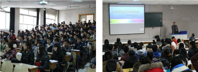 讲座邀请了南方测绘公司总经理孙培岭、南方测绘山东分公司总经理陈春雷为在场师生讲解测绘测量知识。孙经理首先围绕讲座主题,从“中国古代测绘技术”、“中国现代测绘地理信息系统技术”、“中国测绘地理信息系统的发展趋势”三个方面为同学们介绍了测绘技术的发展史。经过孙经理的详细讲解,同学们对测绘测量技术和工具的发展过程有了更进了一步的了解。随后,陈经理为现场师生讲解了GNSS卫星定位技术的发展,他首先介绍了四大卫星定位系统、PTK测量方式的发展概况,之后为同学们介绍了GNSS的最先产品技术并详细讲解了该技术在无人船等其他方面的应用及CORS虚拟参考站技术的拓展应用。最后,讲座在热烈的掌声中圆满结束。