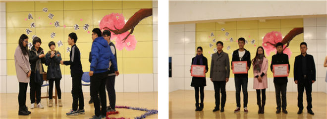 资源与环境学院经过层层选拔最终进入决赛,本次心理情景剧大赛以喜剧化的短剧为主要表演形式,反映出了大学生在当下学习和生活上遇到的心里矛盾和冲突,从不同角度演绎了各种情境下同学们的心理变化起伏。由资源与环境学院同学们表演的《滚蛋吧,烦恼君》,通过讲述一个男同学向一位女学霸表白遭拒后,在负面情绪影响下,他和室友父母发生了矛盾,后来在父母和室友的理解与劝导下重新选择生活的故事。同学们将自己真挚的情感和真诚的泪水融入表演中,深深感动了在场的评委和观众。比赛结束后,进行了颁奖仪式,资源与环境学院凭借自身的优势和创意荣获此次大赛三等奖。