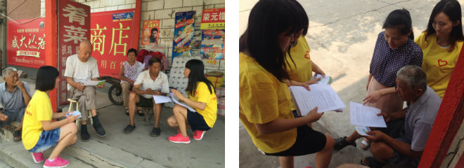 7月22日,全体实践团成员再次来到章丘市普集镇焦家村。实践团首先与当地村委成员进行了沟通,在征得当地村委的同意后,全体成员开始在村中向村民发放环保倡议书、宣传手册及调查问卷。
