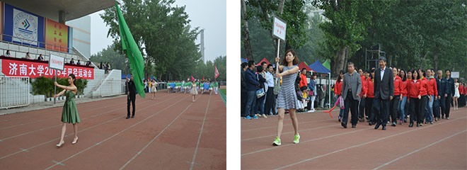 春风送爽,彩旗飘扬,4月29日上午,伴随着活力飞扬的音乐和整齐响亮的口号,各学院方阵精神饱满地走入运动场,济南大学2015年田径运动会正式拉开帷幕,学校主要领导范跃进、程新、张硕秋、杜斌等出席了本次运动会的开幕式。资源与环境学院方阵斗志昂扬,迈着矫健的步伐缓缓走过主席台前,别出心裁的准备与朝气逢勃的表现使在场师生眼前一亮。“魅力资环,逐梦扬帆”的口号彰显着资环学子势在必得的信心,“友谊第一,比赛第二”的理念传递着资环学子团结友好的向往。运动场内锣鼓喧天,观众席上欢呼不断。资源与环境学院啦啦队精神饱满,着装整齐,同学们时刻准备着为运动员振臂高呼、热情呐喊。学院教工、学生运动员们也信心满满,脸上洋溢着笑容,赛前纷纷进行着紧张有序的热身准备。