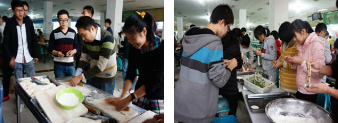 此次联欢主要分为三个部分。首先是夹乒乓球游戏,包饺子作为失败一方的惩罚,获胜方坐等享受胜利果实。输的一方在包饺子时忙的热火朝天,获胜方被他们的欢乐所感染,也纷纷加入到包饺子的行列中。大家就自动分为擀饺子皮和包饺子两个小组,同学们忙的不亦乐乎,很快就完成了饺子的制作。在煮饺子的过程中,大家玩起了猜成语和谁是卧底的游戏,现场一片欢声笑语。一盘盘奇形怪状的饺子让同学们胃口大开,品尝着自己亲手包的饺子,同学们脸上都洋溢着幸福的笑容。在整个活动中王老师与同学们一起快乐劳动,融入到同学中,现场氛围十分融洽。