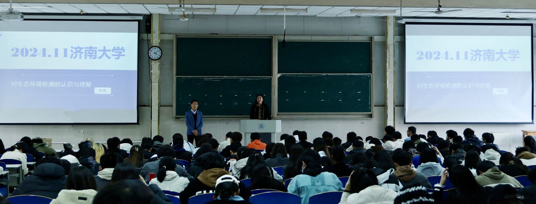 刘庆经理简要分享了自己在济大学习和创业经历,并表示希望通过这次讲座,能够给学生的学习和生活带来一定帮助。刘庆经理从生态环境检测重要性、生态环境检测分类、生态环境检测六要素、相关检测仪器设备、环境监测应用实例五个方面向学生们介绍了生态环境监测的相关知识。通过实际案例讲解了生态环境检测在环境保护中的重要作用。其次,刘庆经理分享了自身对公司管理运营的策略和要求:公正、科学、准确、高效是工作底线,一张网智慧感知、一套数真实准确、一体化综合评估、一盘棋顺畅高效。最后,刘庆经理从就业、考研、自主创业、兴趣爱好四个方面给学生讲述大学规划,表示大学生应在担当中成长,在行动中成就未来。