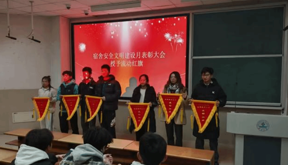 随后,依据建设月安全卫生检查结果,评比选出四个年级共12个“优秀标兵宿舍”并为其颁发流动红旗,这些宿舍整洁有序,物品摆放井井有条,宿舍成员共同营造了积极向上的生活氛围。